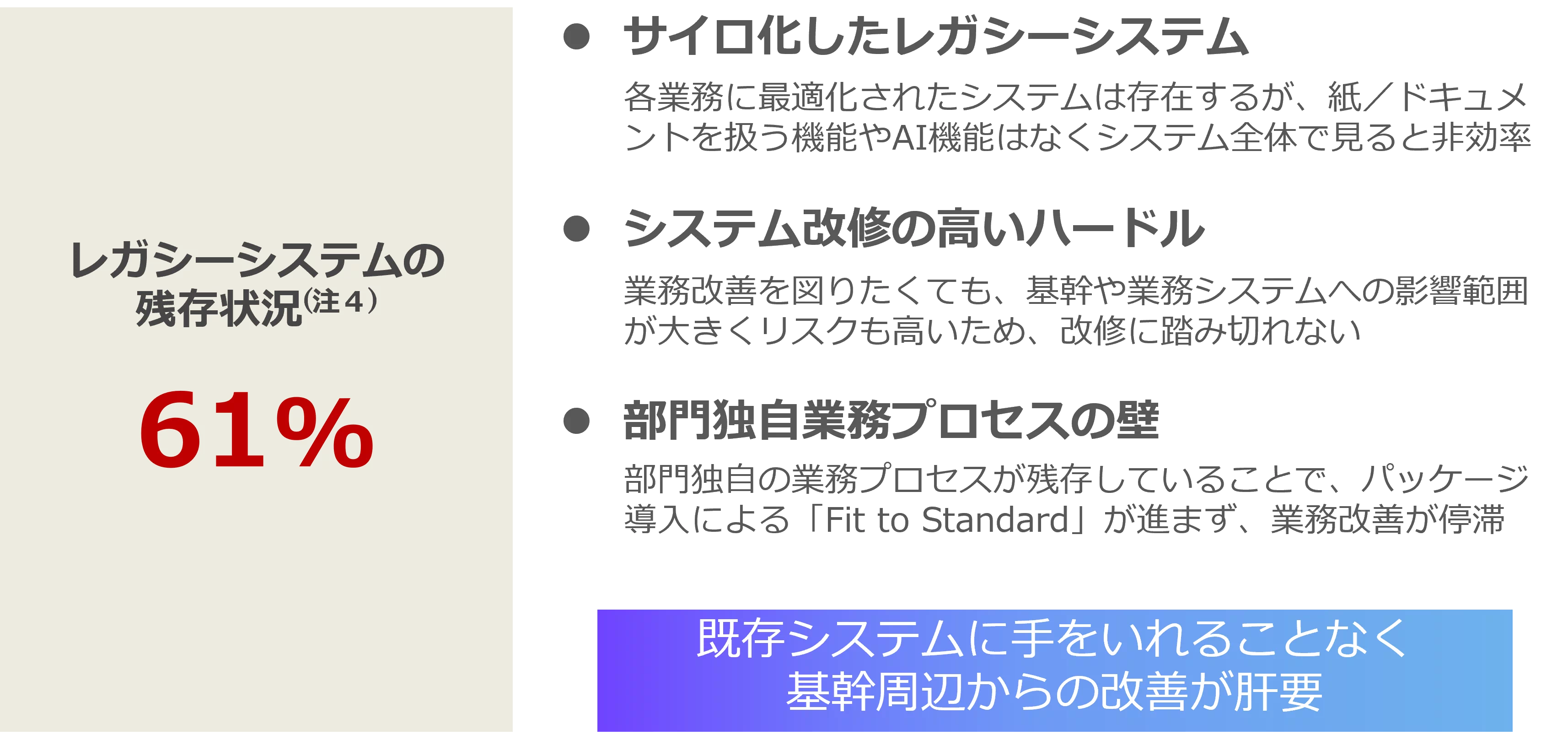 さらに、「現行業務を大きく変えたくない」という現場のバイアスや下図のような「レガシーな既存システムとの連携の難しさ」もあり、単にITツールを導入しても「従来のムダや例外処理をそのままデジタル化しただけ」になり、十分な効果につながりません。