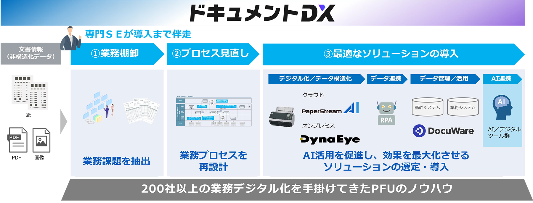 「ドキュメントDX」は、企業内に残る紙・PDF・画像などの文書情報を、PaperStream AI などにより業務で使えるデータに変換し、業務プロセスに組み込むことで、バックオフィス業務の効率化を実現するDX支援サービス体系です。