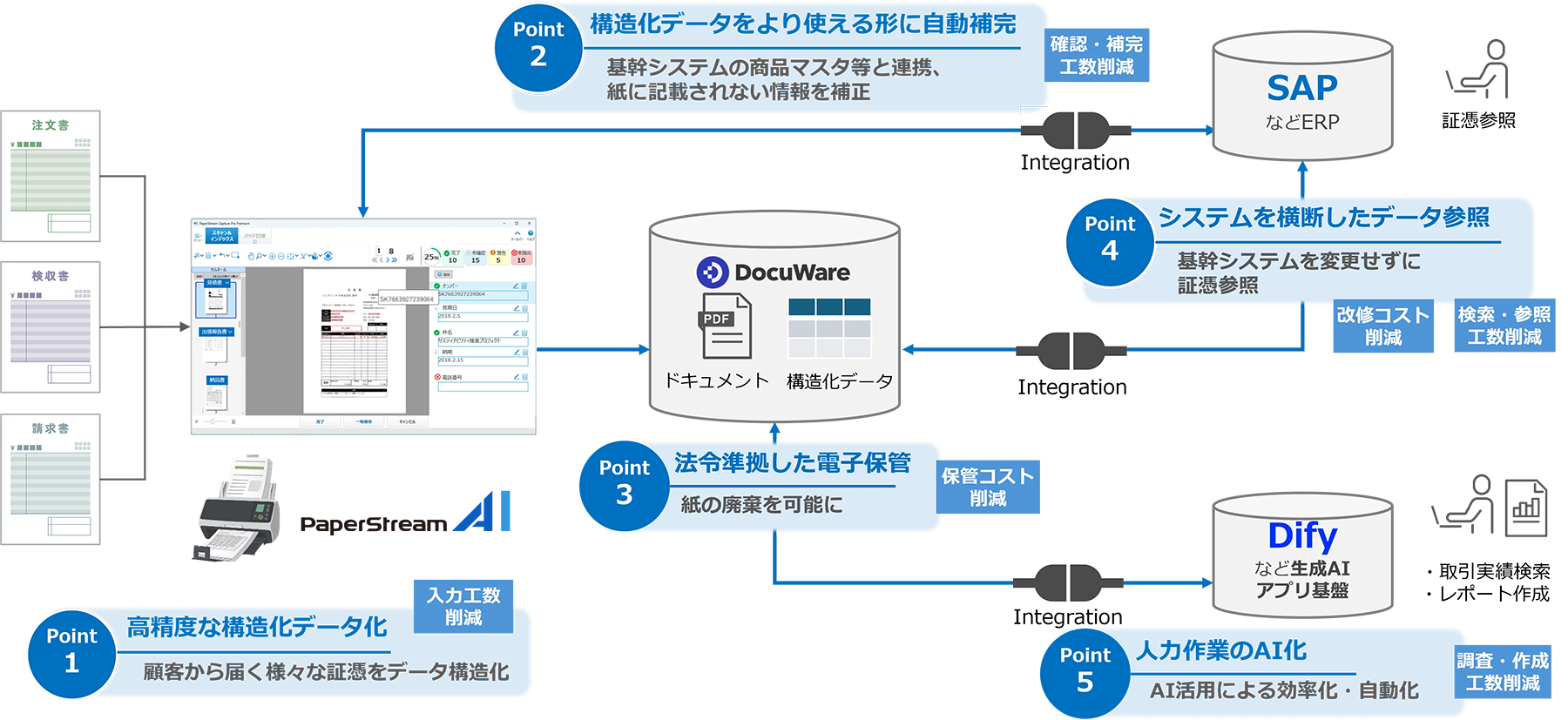 前述のサービスの中核となる新AI-OCR『PaperStream AI』を起点に、紙文書のデータ化から既存システム連携、AI活用までを一気通貫で実現する価値の全体像です。