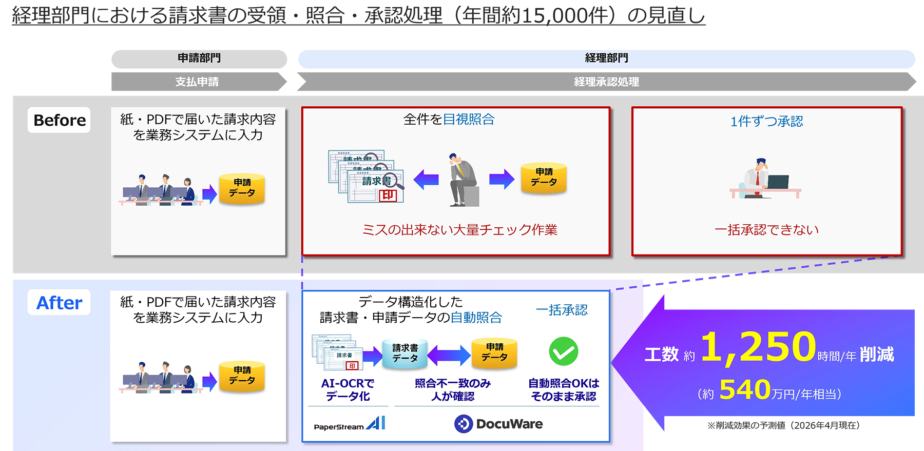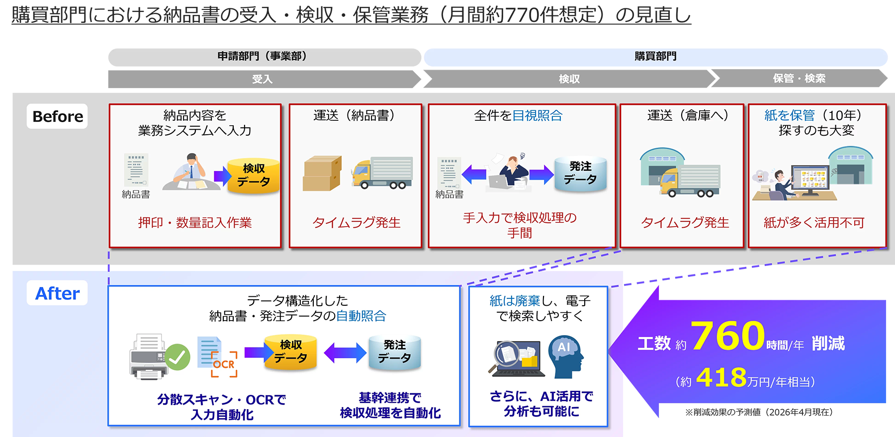 そこで、こうした課題への対応として、紙やPDFで受領した取引関連書類を、業務で活用可能なデータへ変換し、基幹システム連携することで、従来人手に依存していた入力・確認・承認プロセスの効率化とその効果見込みを検証しました。