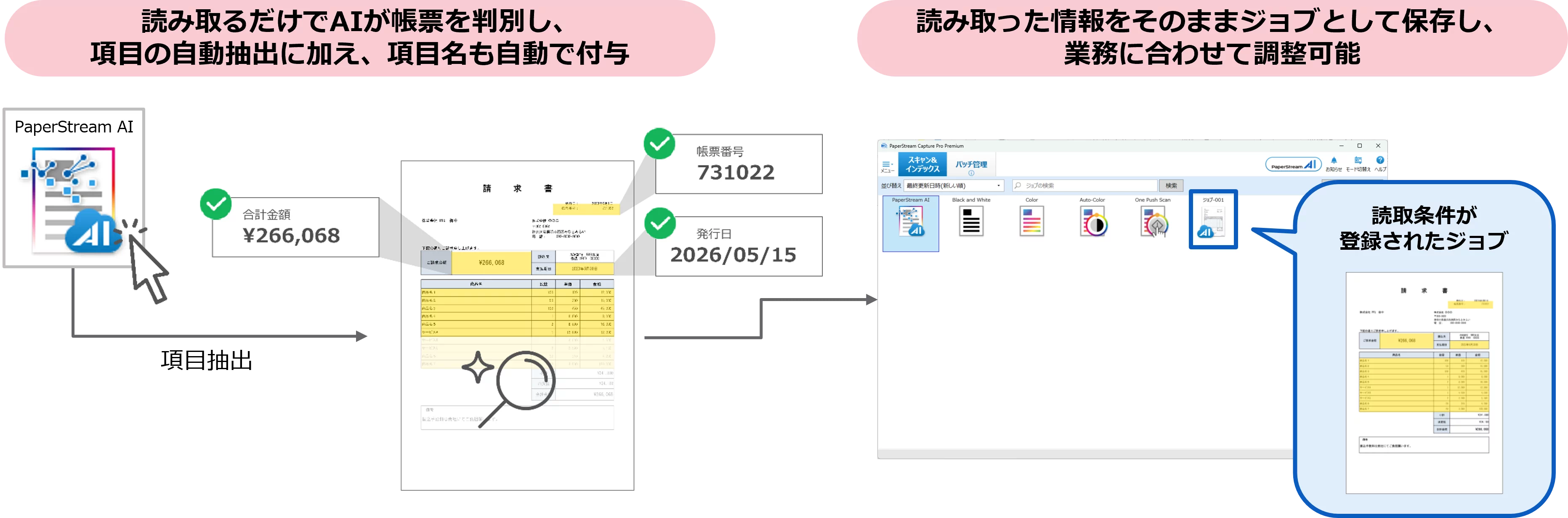 「PaperStream Capture Pro / Capture Pro Premium」と「PaperStream AI」の連携により、スキャンから画像確認、帳票仕分け、OCRまでを1つの流れで実行でき、画面や作業の切り替えを減らして効率良く進められます。