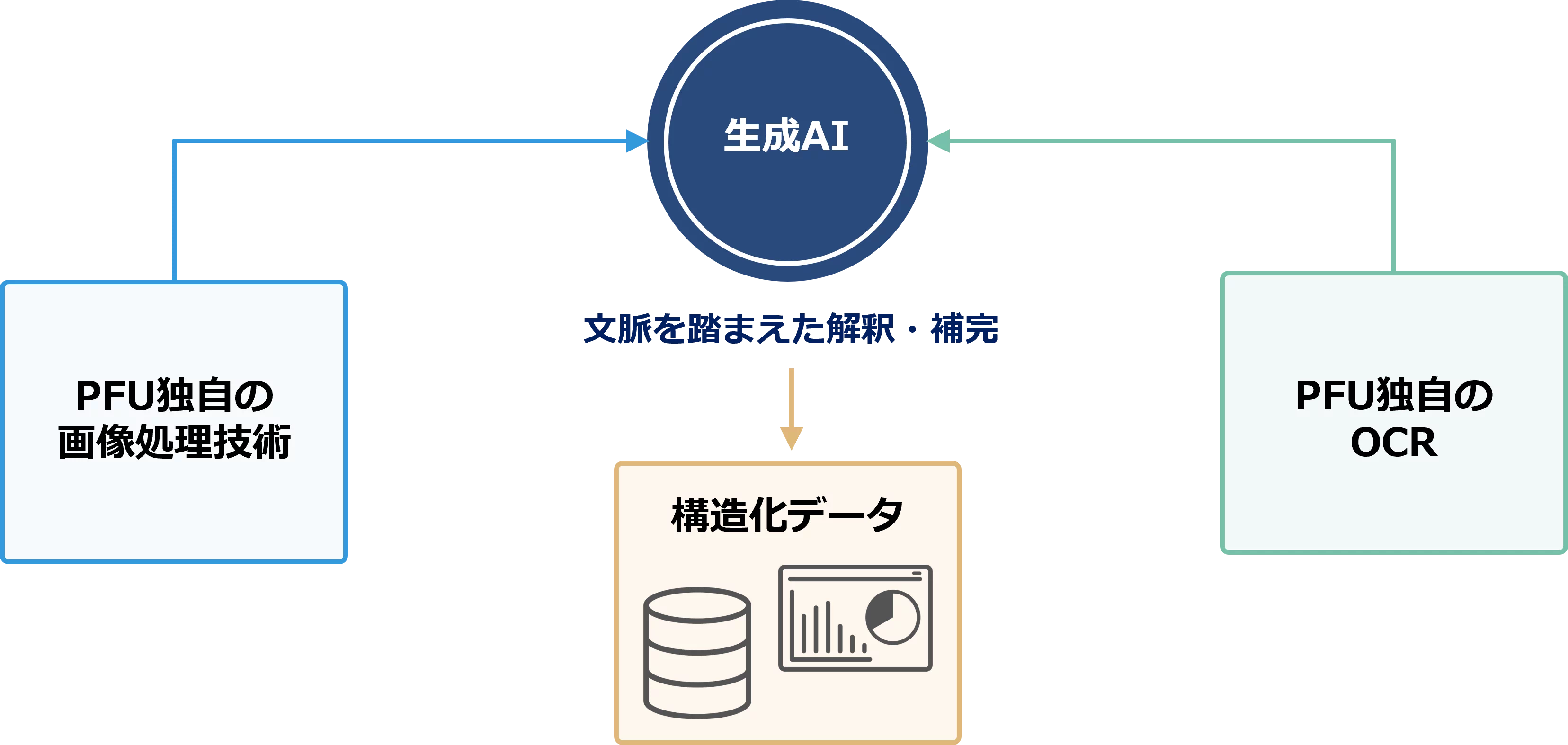 本サービスは、PFUが世界シェアNo.1(注3)のスキャナー「RICOH fi Series」および、国内シェアNo.1(注1)のOCRソフトウェア「DynaEye」で培ってきた画像処理・OCR技術と生成AIを融合しています。帳票全体の構造解析結果と高精度な文字認識結果を統合して総合的に判断する独自技術により、文字認識精度99.99%(注2)を実現しました。