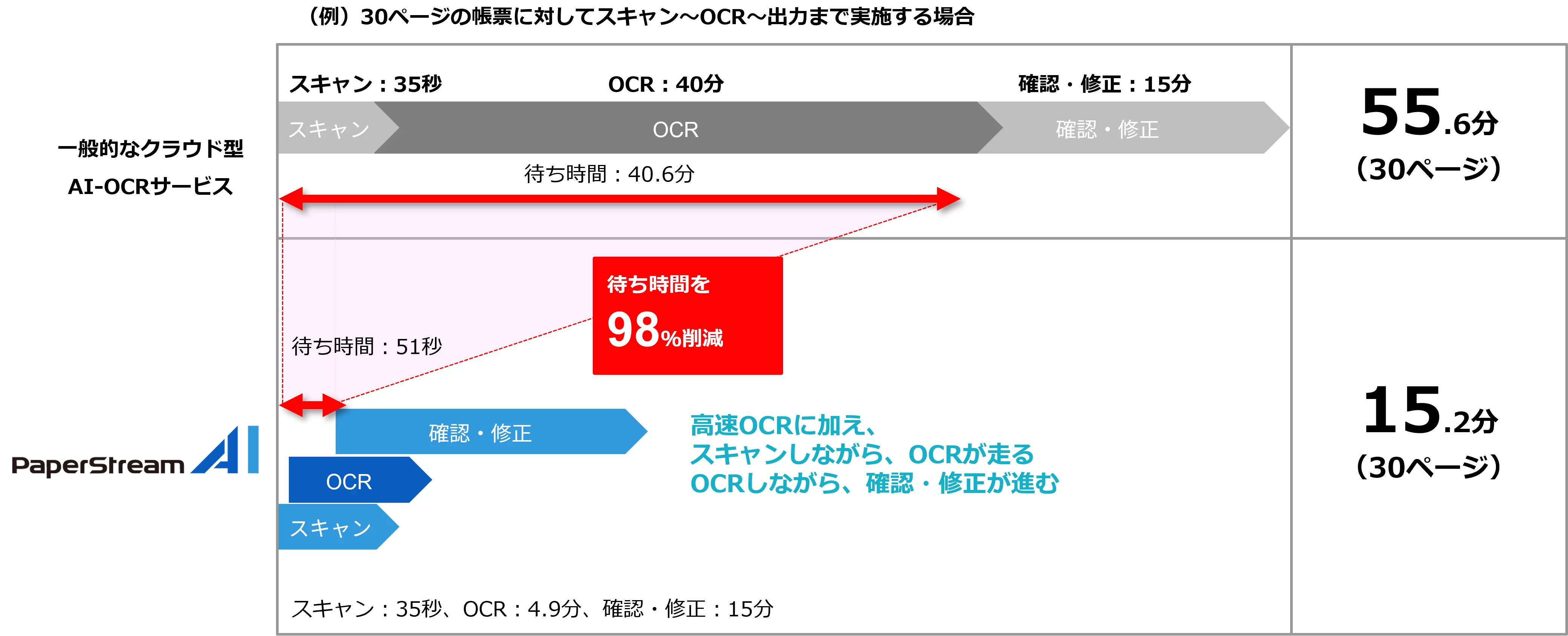 複数OCRエンジンと生成AIを組み合わせて並列処理を行う独自技術によって、高速なOCR処理が可能です。さらに、一般的なクラウド型AI-OCRサービスのように「OCRの認識が完了するまで待ってから確認する」のではなく、OCRの進行に合わせて確認・修正を同時に行えるため、待ち時間を最小化できます。例えば一定条件下では、約98%の時間短縮(注4)が可能です。これにより、処理量が多い場合でもスキャンから出力までのトータル作業時間を短縮します。
