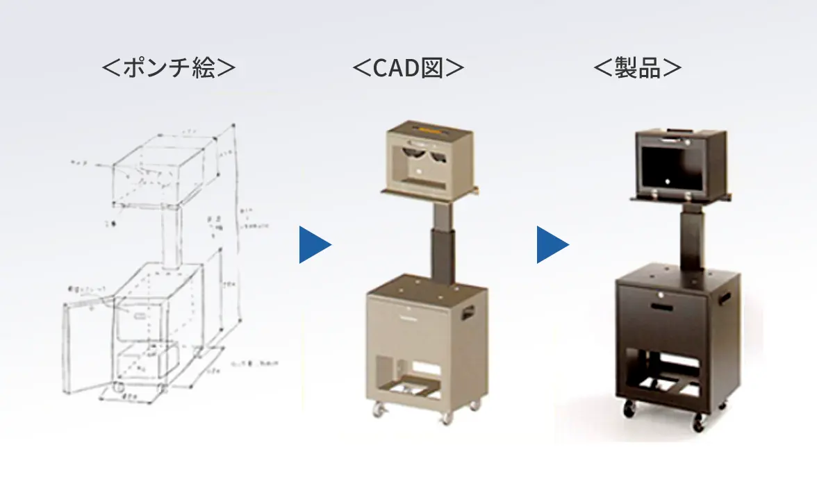 手描きのポンチ絵一枚からでも、企画から設計、調達、製造、検査まですべてをワンストップで、スピード、品質、コストバランスのすべてでお客様の期待を超えるソリューションをご提供します。
