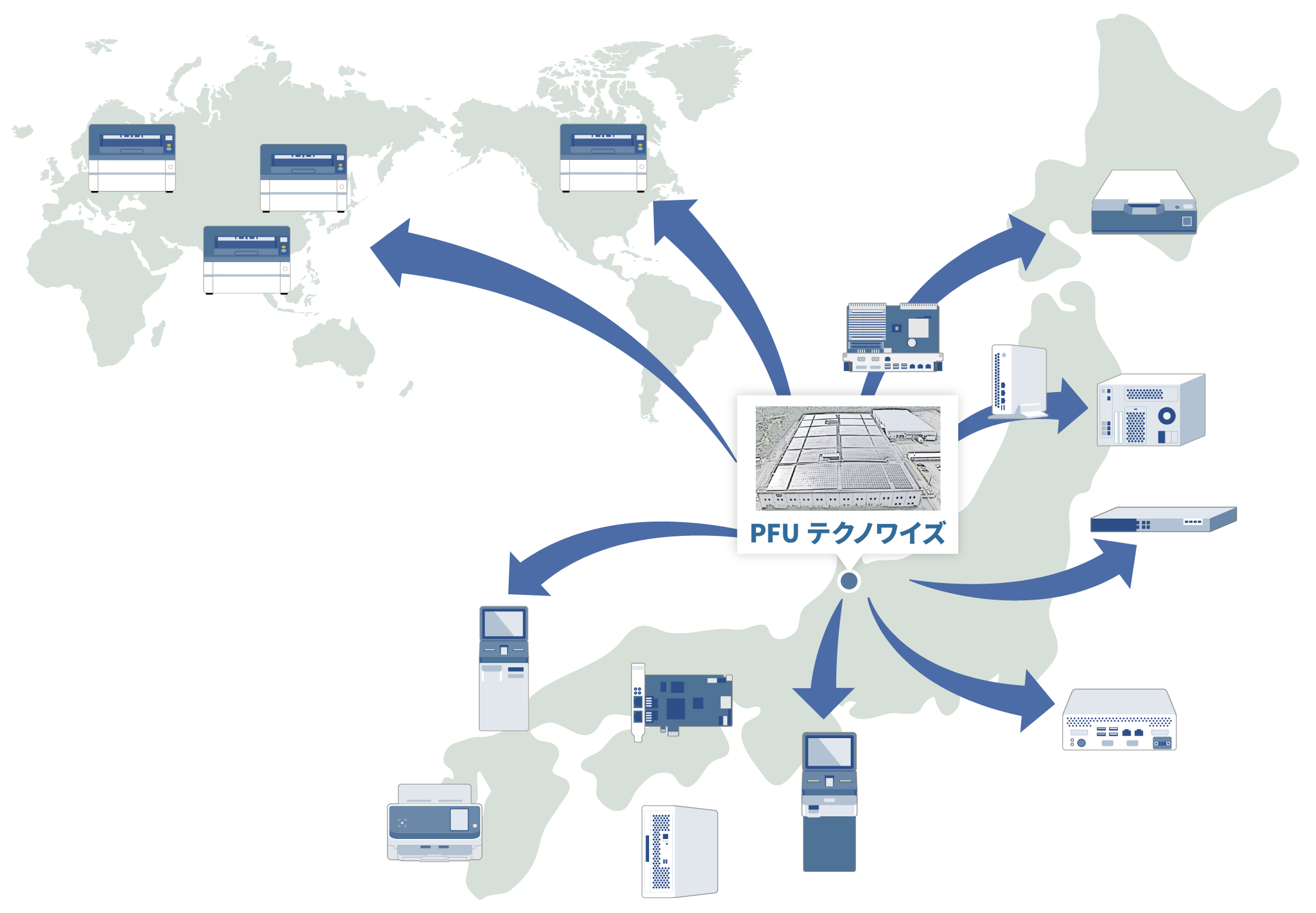 私たちは、親会社である㈱PFUおよびリコーPFUコンピュータ㈱からの委託を受け、IT関連機器の生産を担っています。創業以来、PFUグループが培ってきた「ものづくりのDNA」を受け継ぎ、お客様の期待を超える品質と価値を実現するため、日々生産現場で革新を続け、確かな技術力と改善への情熱で、これからもPFUグループの製品を世界へ送り出す一翼を担ってまいります。