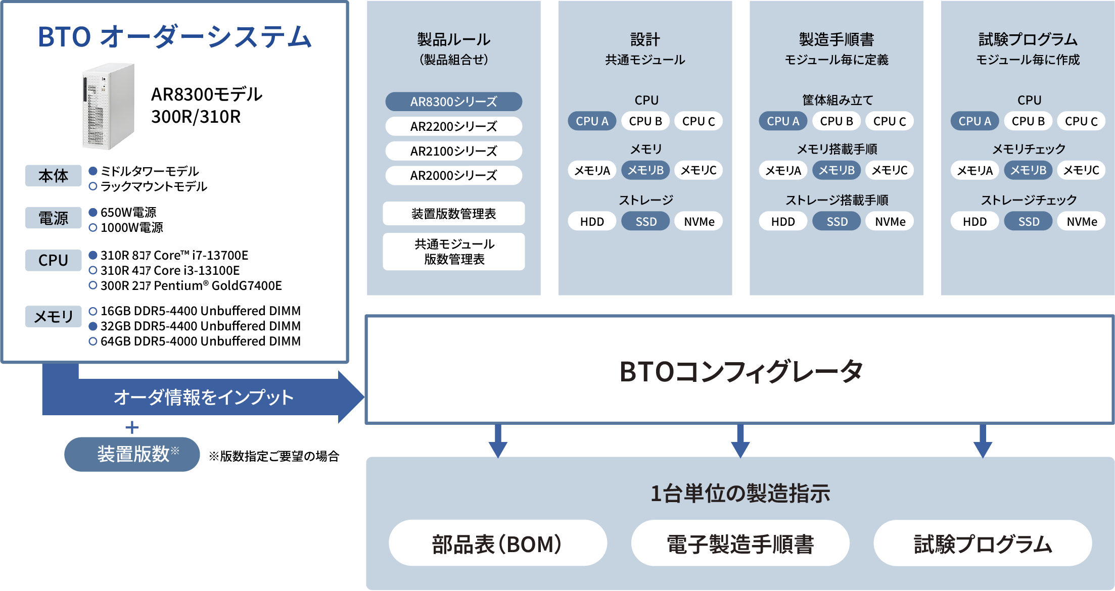 受注内容に応じたBTOコンフィグレーション、高品質をお約束する組立支援システム、最適効率を実現する生産スケジューラーを活用し、設計から製造までデジタルデータで連携。標準化と自動化、モジュール化された工程により短納期・高品質・低コストを実現し、変化の激しい市場で競争力を確保します。
