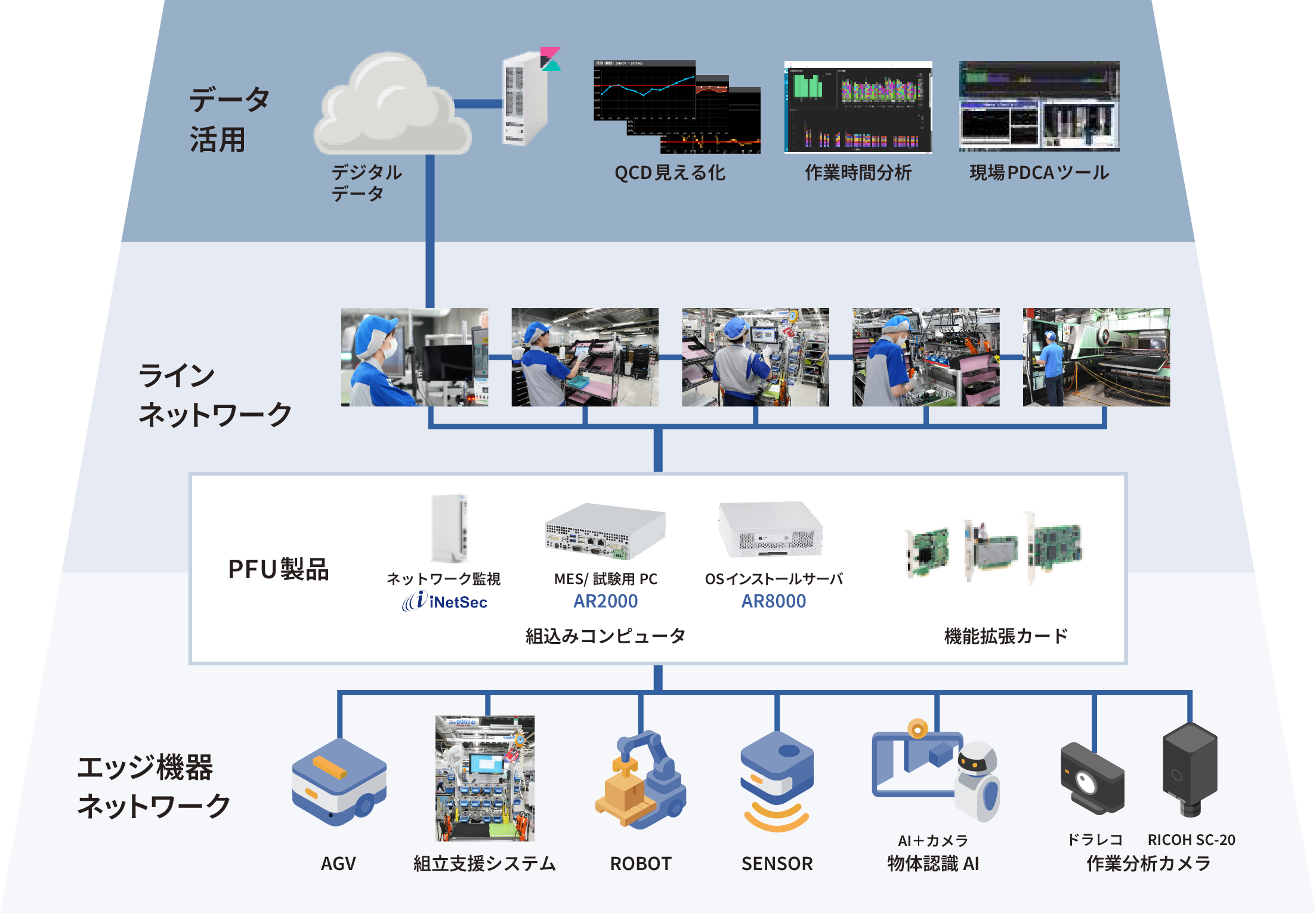 当社は、エッジ機器ネットワークとIoTを活用し、生産現場のあらゆる設備やセンサーをつなぐデジタルファクトリー化に取り組んでいます。リアルタイムデータを収集・解析し、現場での迅速な判断とクラウドでの高度分析を両立。稼働状況の見える化、品質の安定、予防保全を実現し、データドリブンなものづくりによる生産性向上と競争力強化を推進しています。
