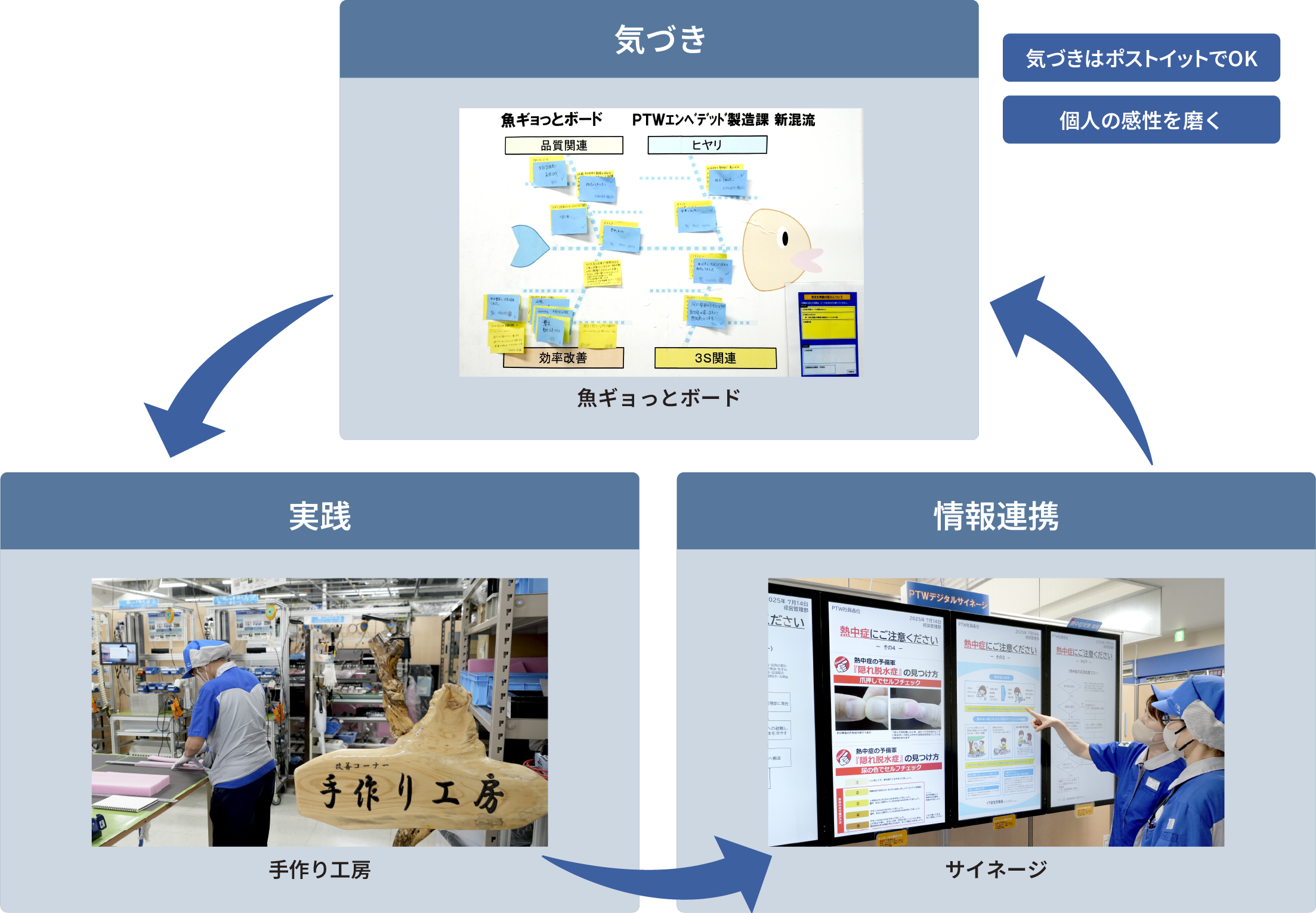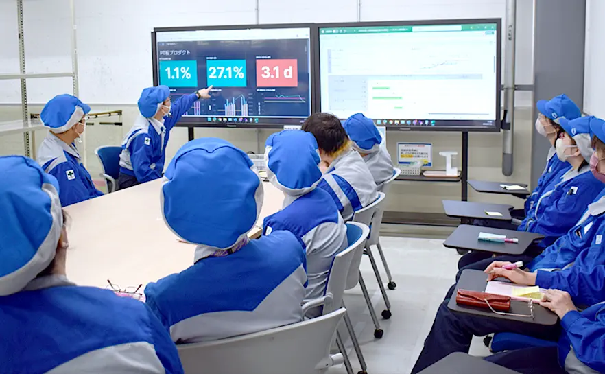 提案制度で現場の気づきを集め、ものづくり工房で治工具や改善品を迅速に試作・実装。さらにデジタルサイネージで改善事例や生産・品質情報をリアルタイム共有し、全員の意識統一と改善スピードを加速しています。現場の知恵と工夫を活かし、効率的で柔軟なものづくりを実現します。