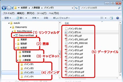 (1)リンクフォルダ : リンクフォルダで指定したフォルダのアイコンは、楽²ライブラリのアイコンで表示されています。 (2)書庫のフォルダ : フォルダ名が書庫名です。 (3)キャビネットのフォルダ : フォルダ名がキャビネット名です。 (4)バインダデータ格納フォルダ : フォルダ名は「バインダ<数字>」の形式です。 (5)楽²ライブラリのデータファイル (1) (2) (3) のフォルダの中には Folder.ini というファイルがあり、情報が格納されています。 2. 書庫