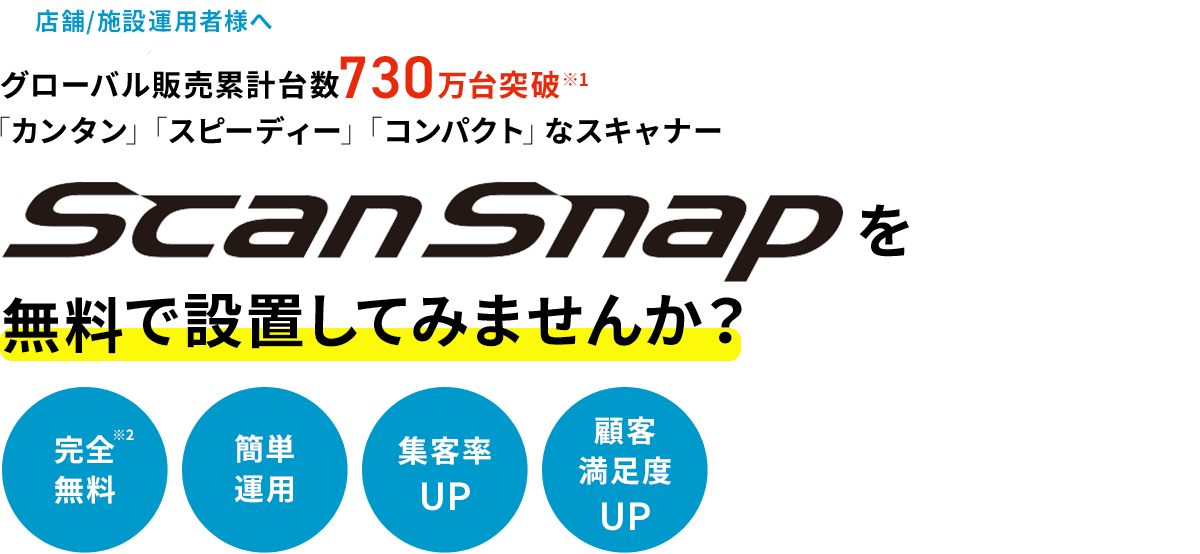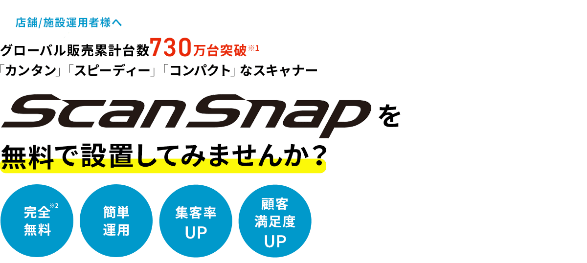 施設に「ScanSnap」を設置することで、お客様は自由にスキャンサービスをご利用いただけます。