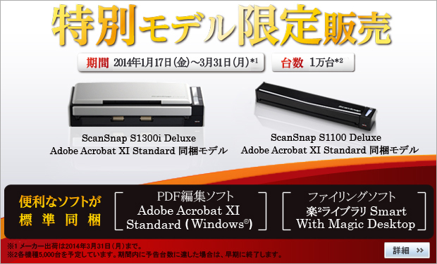 期間中にScanSnap S1300i DeluxeならびにScanSnap S1100 DeluxeにAdobe Acrobat XI Standardを同梱した特別モデルを1月24日(金曜日)から販売いたします。 (受注は2014年1月17日より開始)