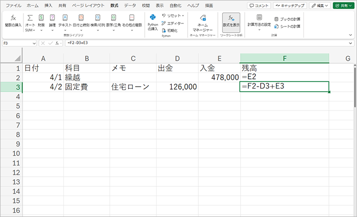 その次の残高には、「(前行の)残高」-「出金」+「入金」を意味する「=F2-D3+E3」と入力します。