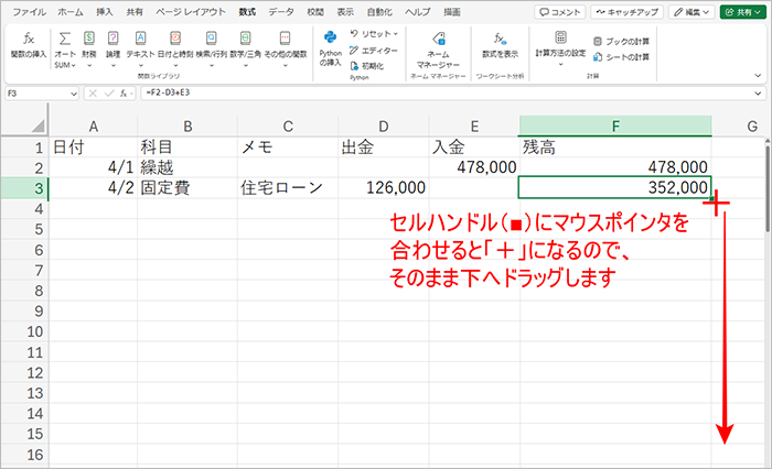あとはそのセルの数式を下へ向かってコピーするだけです。これで、「(前行の)残高」-「出金」+「入金」を意味する数式をそれぞれの行にコピーできました。