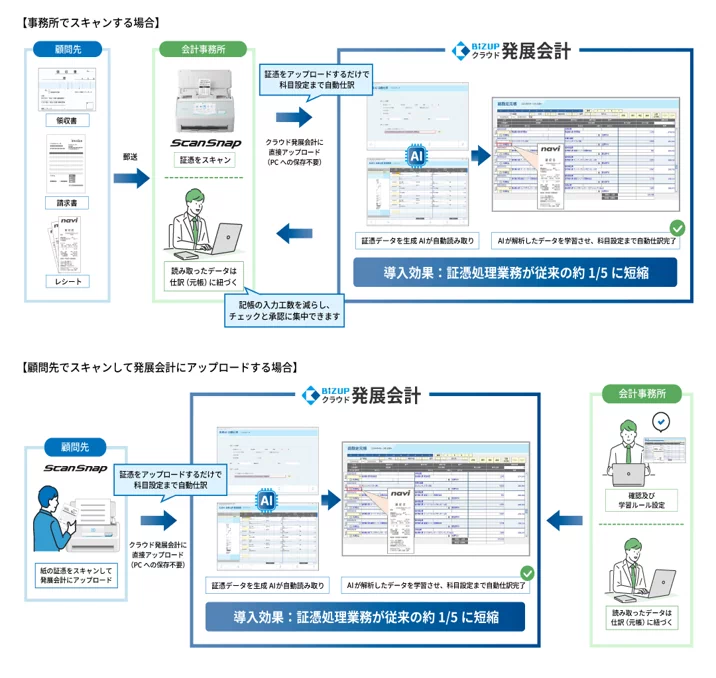 事務所でスキャンしたデータから自動仕訳を作成して効率化を図るのと同時に、顧問先にスキャンまで対応頂く仕組みの構築が可能です。