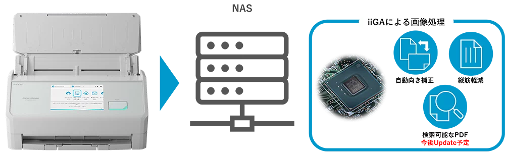 iX2500では、次世代SoC「iiGA」の処理により、ネットワークフォルダーに保存する際にも、向き補正や縦筋軽減といった画像処理がご利用いただけます。今後のアップデートでは、ネットワークフォルダーへの直接保存時でも検索可能なPDFの保存にも対応予定です。