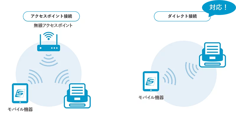 Wi-Fi環境がない・利用できない場所などで、スキャナーとデバイスを1対1で直接Wi-Fi接続するダイレクト接続モードに対応しました。