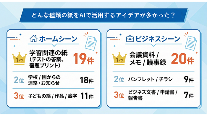 第1期(2025年6月〜9月)には、紙とAIの連携を活かした多様なアイデアが寄せられ、家庭・教育・ビジネス領域における課題解決と新たな価値創造が進んでいることが明らかとなりました。