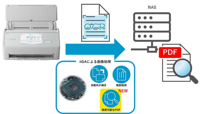 この度のアップデートでは、ScanSnap iX2500(以下 iX2500)からネットワークフォルダーへのPCレス直接保存時にも、検索可能なPDFでの保存に対応しました。次世代SoC「iiGA」の処理能力により、PCやスマートフォンを介すことなくiX2500だけでネットワークHDD(NAS)上のフォルダーへ検索可能なPDFの保存が完結します。