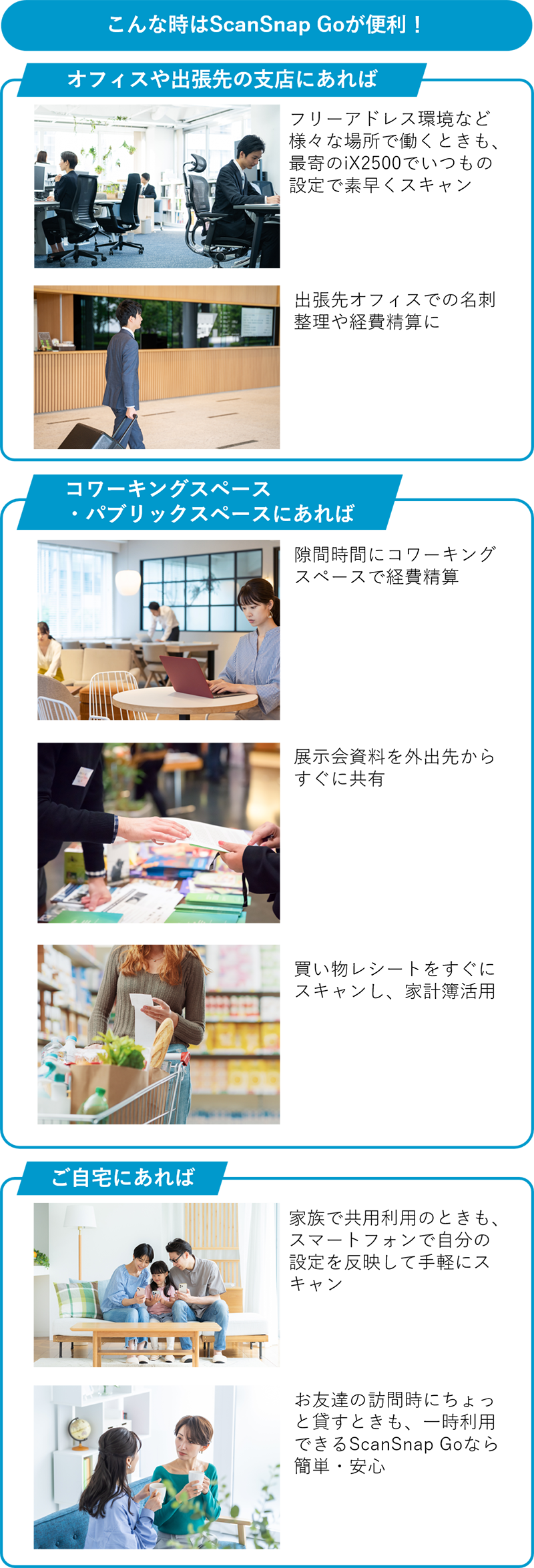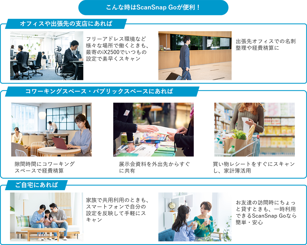 オフィス、ご自宅、パブリックスペースやコワーキングなど、様々な場所のiX2500をいつもの設定、いつもの宛先、いつもの使い勝手で、まるで自分のScanSnapのように利用可能です。