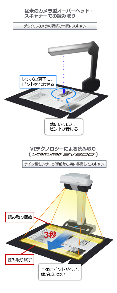 高被写界深度レンズ、ライン型CCDセンサー、高指向性LED光源を組み合わせた「VIテクノロジー」を搭載。離れた位置から原稿を読み取っても画質のムラを最小限に抑え、均一で読みやすいイメージデータを生成します。