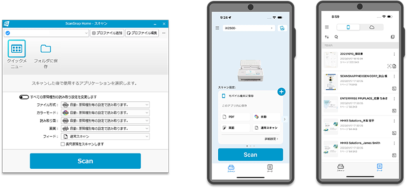 PC版/モバイル版のScanSnap Home間でスキャンデータを同期でき、PC・スマートフォンどちらでスキャンしても同じデータにアクセス可能。