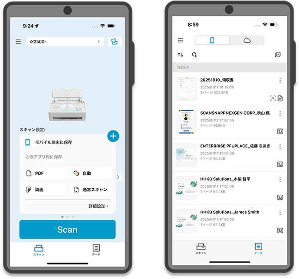 iX2500となら、スマートフォンを近づけることで一時的にモバイル版ScanSnap Homeを接続し、いつもの設定で簡単スキャン!
