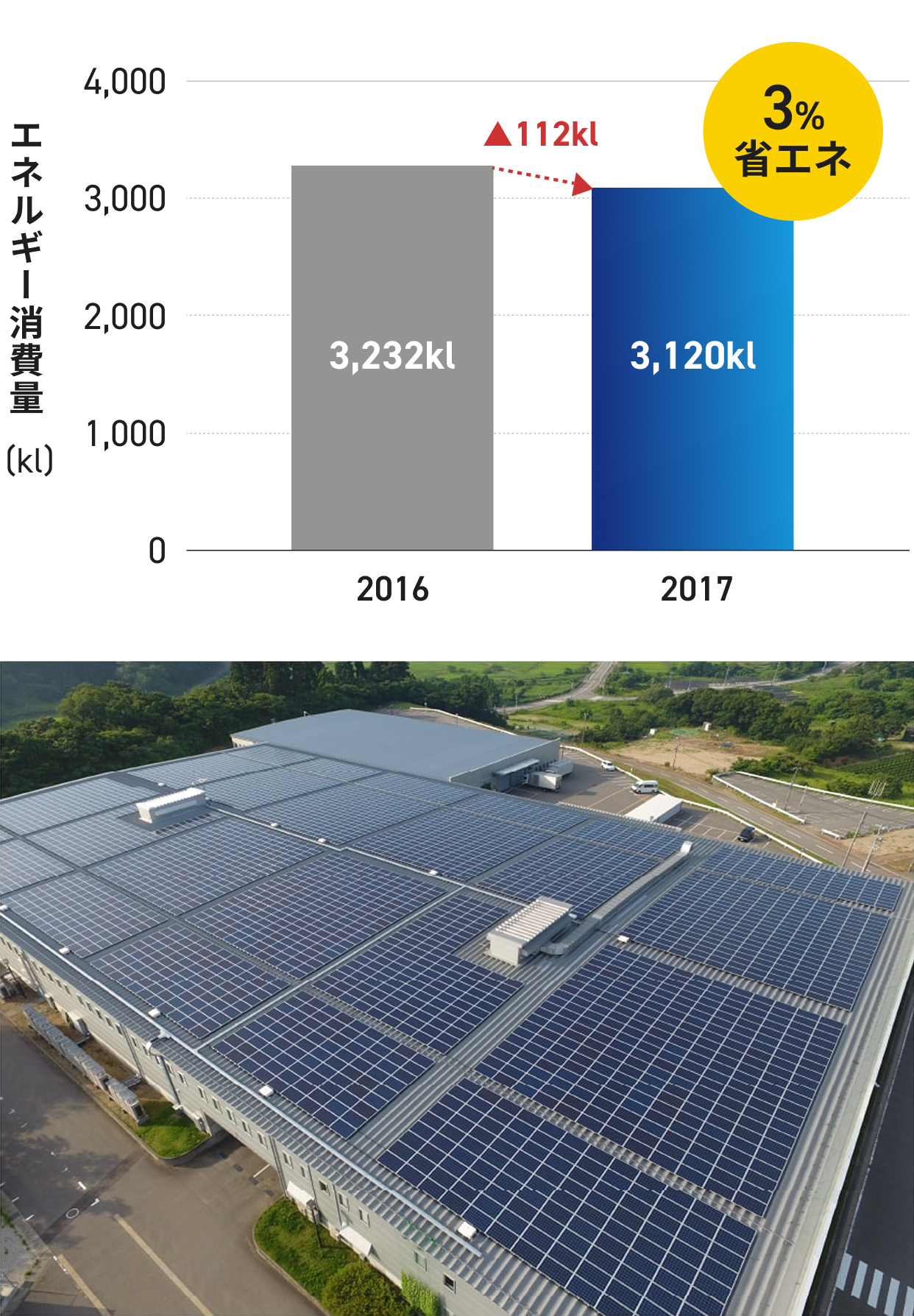 ProDeSセンターの屋根に太陽光パネルを設置 → 全事業所エネルギー消費量-3%